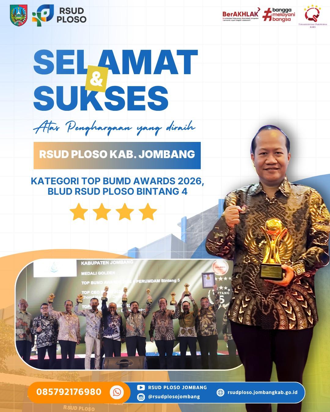 Ajang penghargaan yang merupakan kegiatan penilaian kinerja BUMD terbesar dan paling membanggakan di Indonesia ini mengusung tema "Inovasi BUMD Dalam Pembangunan Berkelanjutan". Dalam kesempatan tersebut, RSUD Ploso sukses meraih predikat sebagai TOP BUMD Awards 2026 BLUD-RSUD # Bintang 4.