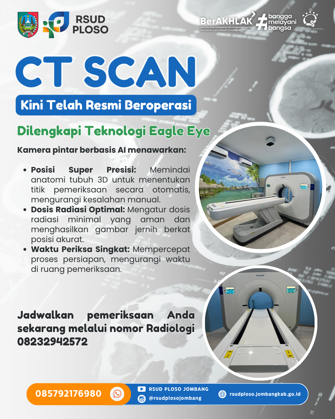 Layanan CT Scan di RSUD Ploso saat ini telah terpasang sempurna di unit Radiologi. Fasilitas ini pun telah dinyatakan memenuhi standar keamanan setelah lolos Uji Kesesuaian dan mengantongi izin operasional dari BAPETEN. Saat ini, pihak manajemen sedang mematangkan proses administrasi akhir untuk kredensial BPJS Kesehatan agar layanan ini segera bisa dinikmati oleh seluruh lapisan masyarakat.